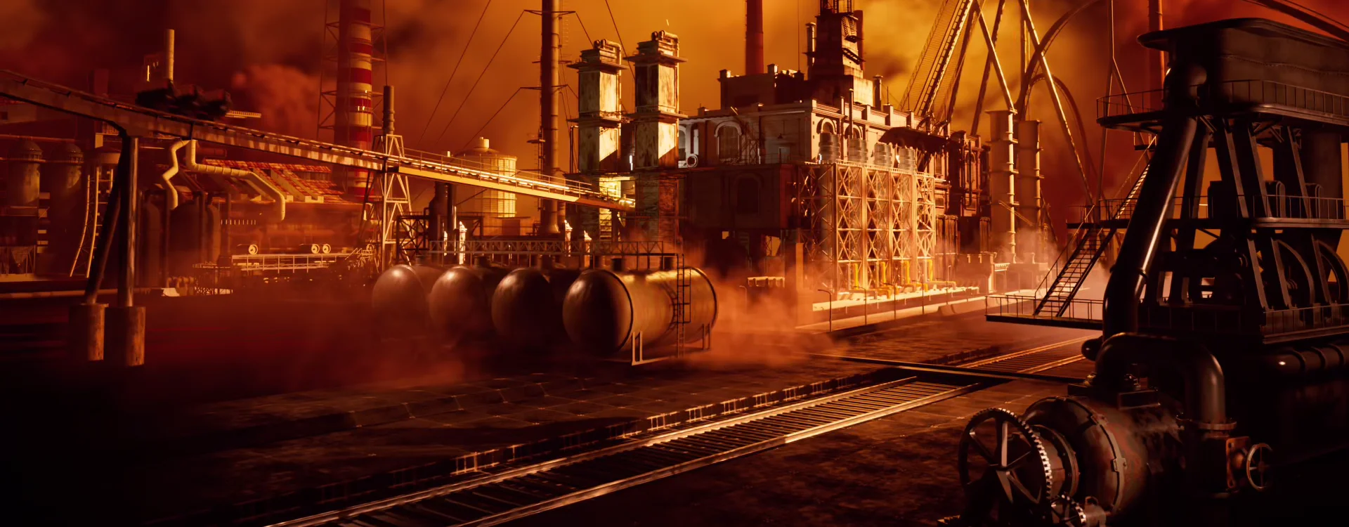 This short teaser highlights a dilapidated steel mill, where billowing factory smoke stacks loom ominously in a saturated orange sky. The production troop created fluid sims of smokestacks, molten metal pouring, hot sparks, and bubbling lava using Houdini.